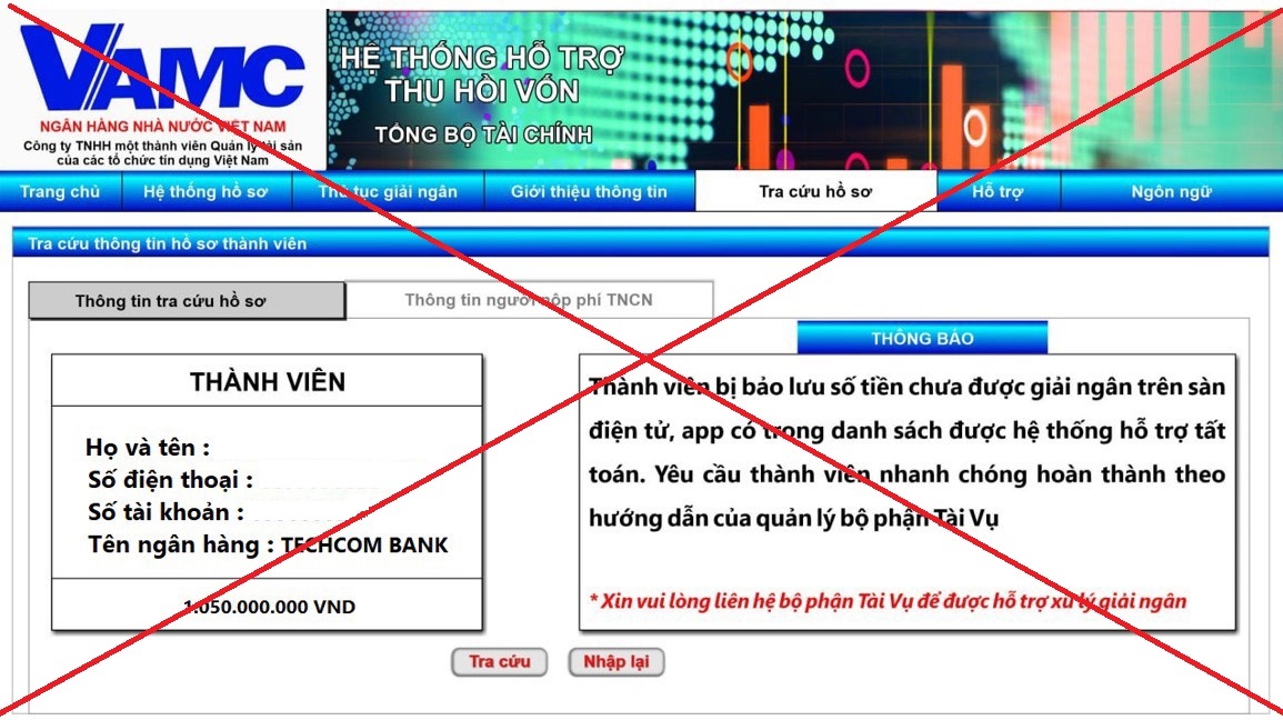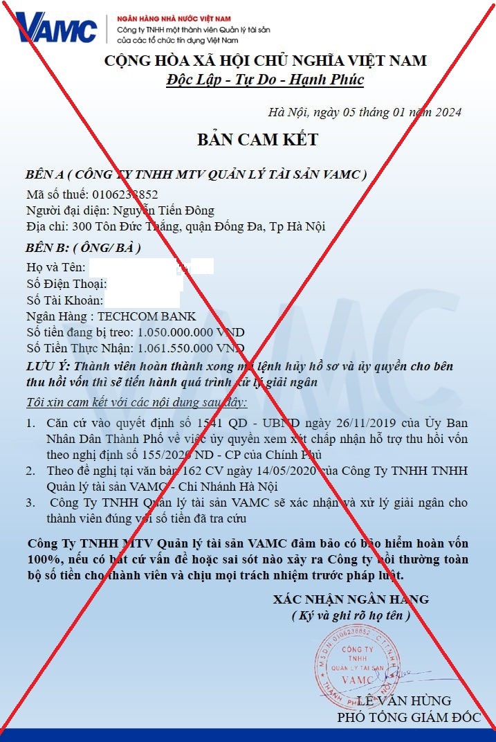 Cụ thể: Thông qua nền tảng mạng xã hội, đối tượng lừa đảo liên hệ với những người có nhu cầu thu hồi vốn, các đối tượng này giả mạo, lấy danh nghĩa là nhân viên của VAMC, sử dụng các thông tin, hình ảnh giả mạo VAMC, hướng dẫn người có nhu cầu thu hồi vốn đăng nhập vào trang web tự tạo và đăng ký thành viên (Trang web này cũng sử dụng các thông tin, hình ảnh giả mạo VAMC), đặc biệt các đối tượng này còn gửi văn bản cam kết với các thông tin giả mạo về tên của VAMC, địa chỉ trụ sở, người đại diện theo pháp luật, người ký văn bản, chữ ký, mẫu dấu của VAMC để tạo lòng tin cho người có nhu cầu thu hồi vốn, sau đó yêu cầu những người này chuyển khoản một số tiền gọi là phí thu hồi vốn để lừa đảo, chiếm đoạt (Chi tiết một số hình ảnh, thông tin giả mạo VAMC đính kèm).