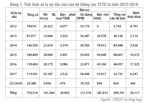 Tóm lại, trong thời gian qua, quá trình cơ cấu lại và xử lý nợ xấu của hệ thống các TCTD đã có được những chuyển biến tích cực và thành công đáng kể, góp phần nâng cao hiệu quả hoạt động của hệ thống TCTD. Tổng nợ xấu lũy kế từ năm 2012 – đến cuối quý I/2018 đã xử lý được khoảng 753 nghìn tỷ đồng nợ xấu, trong đó: TCTD tự xử lý (sử dụng dự phòng rủi ro; bán, phát mại tài sản đảm bảo và do khách hàng tự trả) khoảng 455 nghìn tỷ đồng, chiếm trên 60%; nợ bán cho VAMC chỉ có 282 nghìn tỷ đồng, chiếm gần 40% (Bảng 1). Theo đó, đến cuối tháng 6/2018, tỷ lệ nợ xấu so với so với tổng nợ là 2,09%, giảm so với thời điểm cuối năm 2016 (2,46%); nếu tính cả nợ xấu ngoại bảng, các khoản nợ xấu đã cơ cấu và nợ xấu tiềm ẩn, tỷ lệ nợ xấu của toàn hệ thống ngân hàng ở mức 6,6 – 6,7%, thấp hơn đáng kể so với cuối năm 2016, nhưng vẫn còn ở mức cao. (Bảng 1)